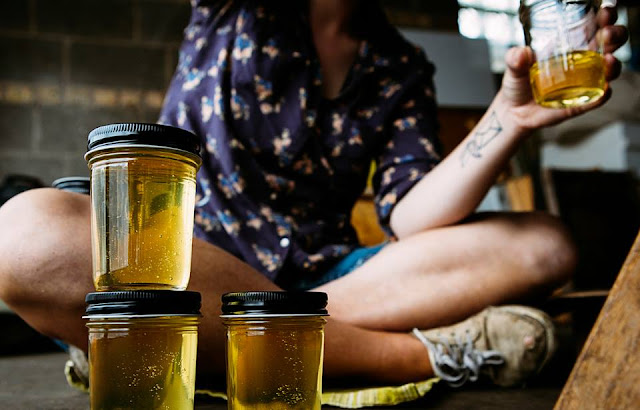 6. when the time comes, strain your essence into a sterilized glass jar. add an equal amount of preservative, either alcohol, vinegar, or glycerine.